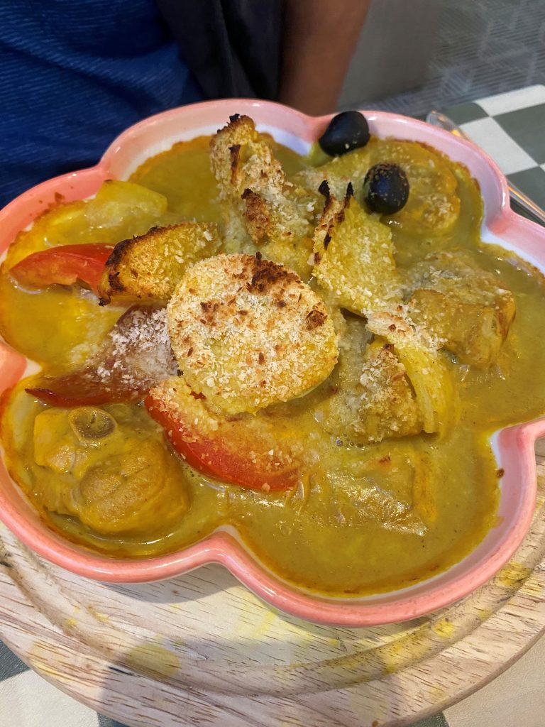 We see nice Portuguese azulejos and buildings, and all streets have a Portuguese and a Chinese name. Of course the typical calcada Portuguesa, the black and white stone tiles on the floor. For lunch we have an interesting mix of food. Japanese and a Portuguese coconut curry with rice. I never saw this curry in Portugal. Is it Portuguese? I cannot even buy (high quality) coconut milk in a store.