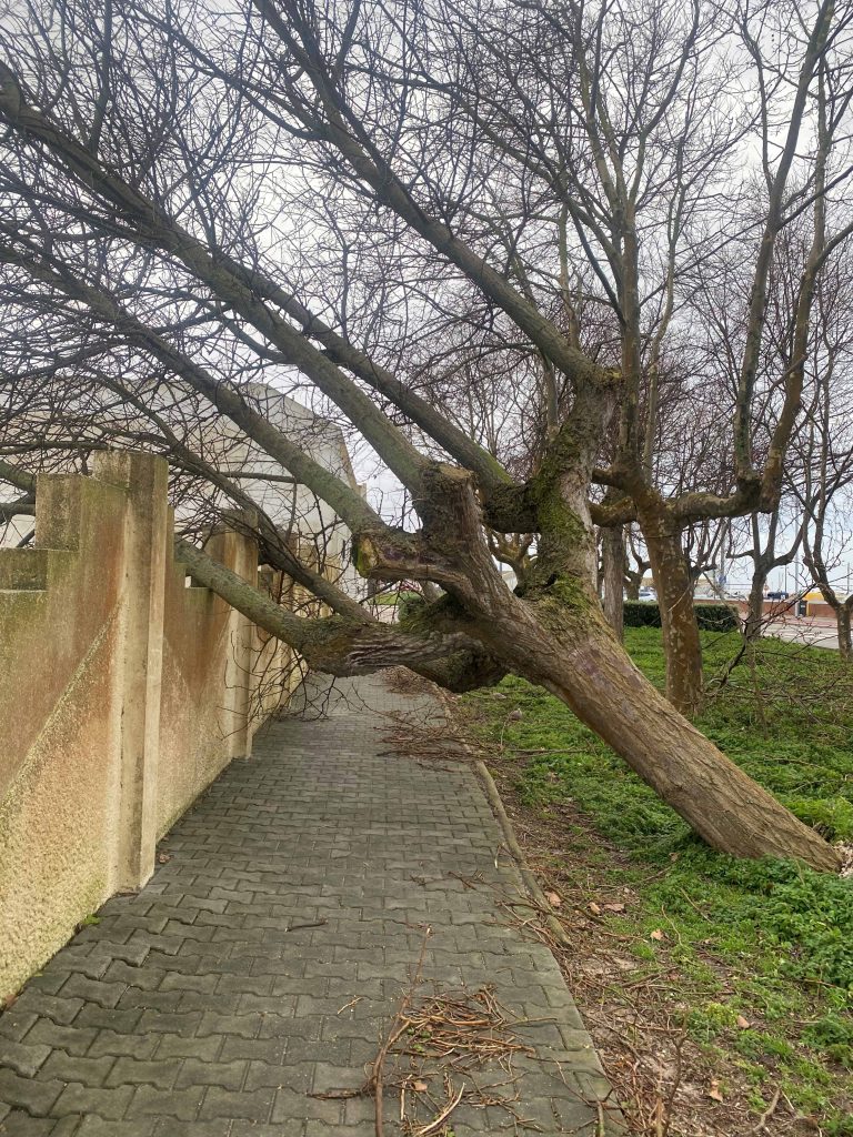 It is dry and quiet as it should be after a storm. There are a lot of fallen trees, and garbage containers.