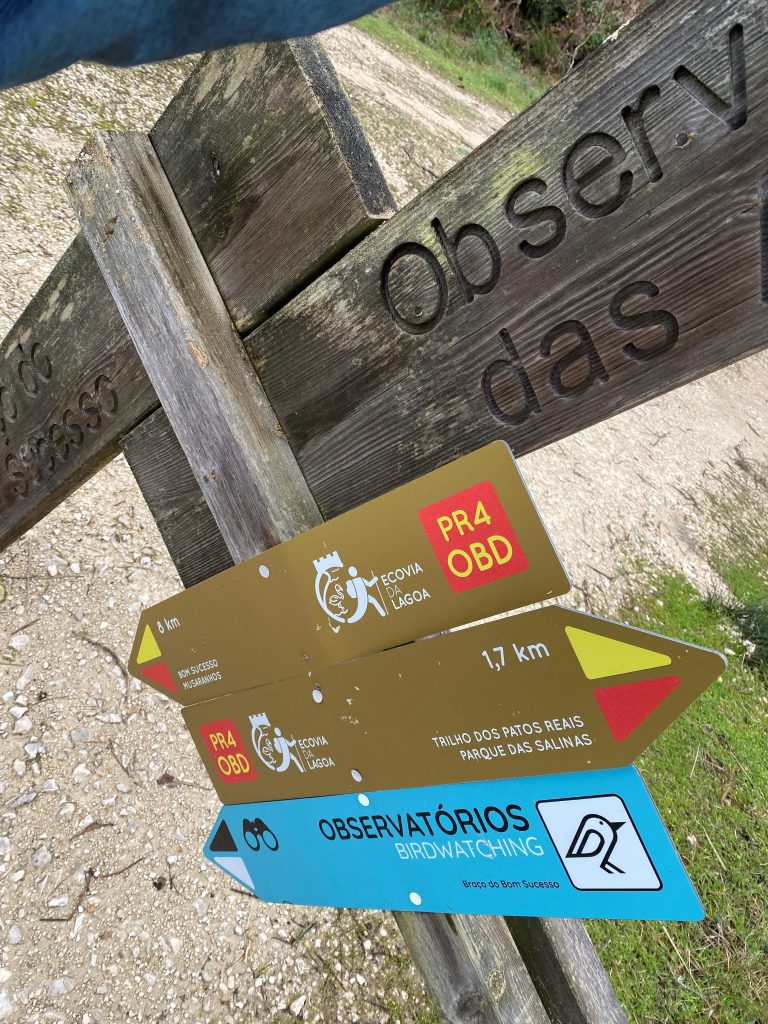 After a long while, I reach the road, that leads to the Golf park. It is a long one, and quite boring. After the Golf Park, I head to the Lago Obidos, and I can walk next to it. It is a great view, there is a lot of water. I see on my Google maps that I need to go from the lake to really pass it. I do think I can continue. There must be a path which connects to the road later on. There are arrows for a Observatory for birds, and there is a marked red-yellow path. When I finally see the Observatory I like to go up to see where I can walk. Everywhere there is a lot of water. Coming closer, I see I can’t pass.