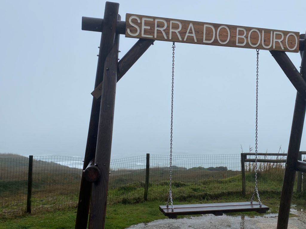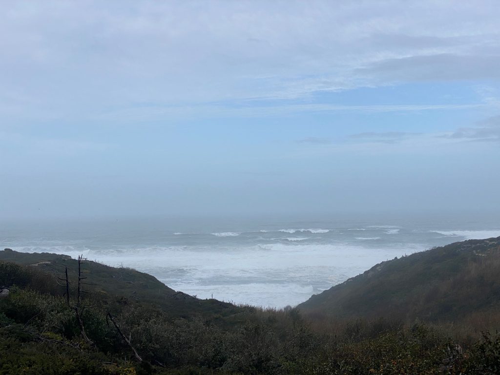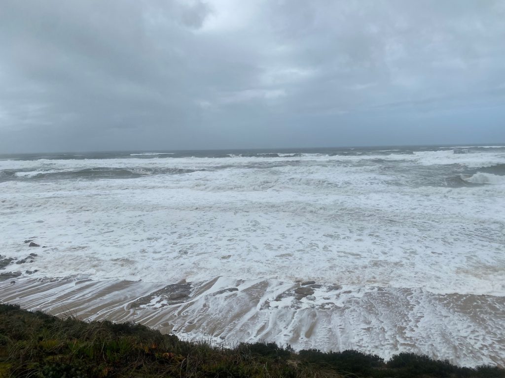 I pass Serra do Bouro, and Boavista. And then Sao Martinho de Porto, a nice bay, you see already long before you arrive there. This beach village, is struck by the storm. It is 11:30 and nothing is open. People are not around to clean. Maybe the people are litarally ‘struck’ by the storm? The electricity must be down and it is a mess, sand everywhere and fallen signs etc.
