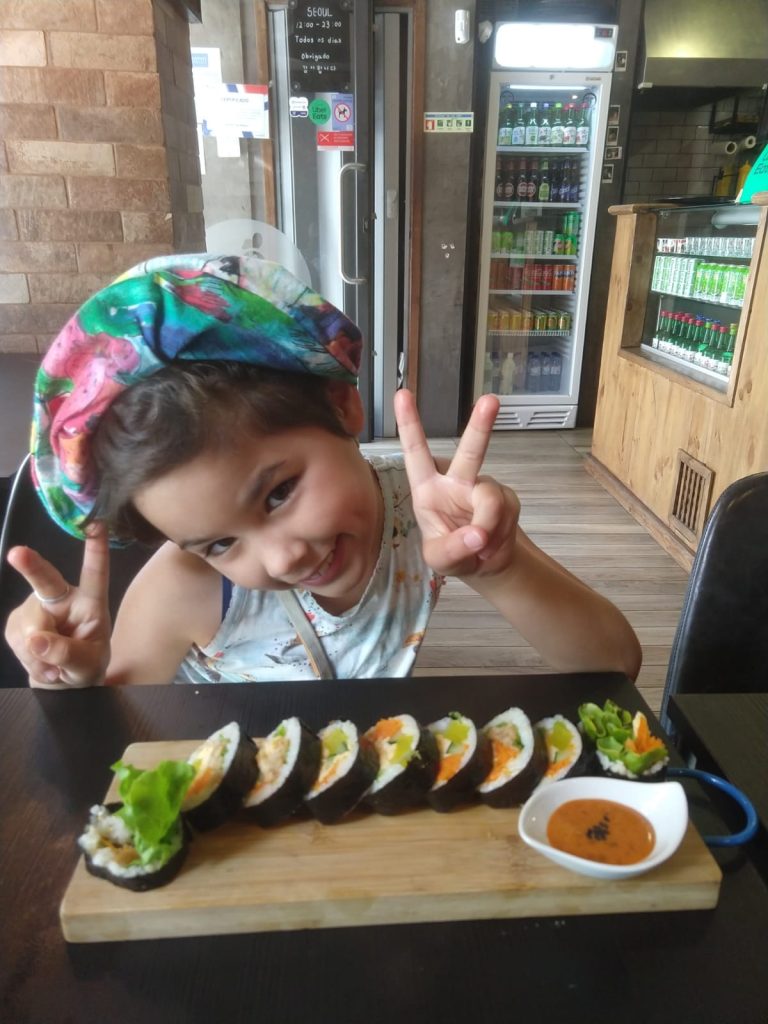We are fan of Asian food. Because it is so hard to get here, we regularly go to Korean place at Praca de Commercio. At Seoul Chicken on the opposite side you have very nice fried chicken and Kimbab with tofu, also to take home. But we sit at across this fast food place and eat at Gangnam where we eat noodles, rice or Korean BBQ and the Kimbap, this is a Korean Sushiroll.